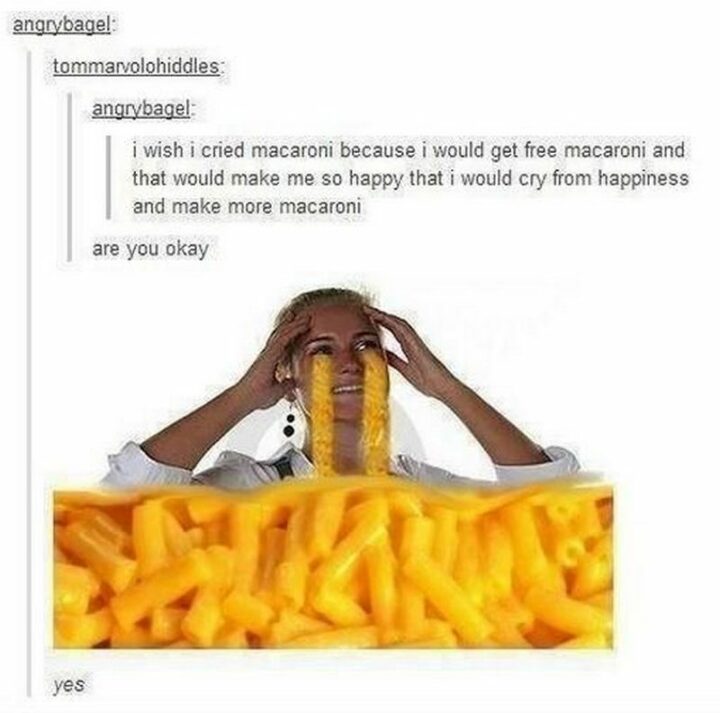 “I wish I cried macaroni because I would get free macaroni and that would make me so happy that I would cry from happiness and make more macaroni. Are you okay?”
