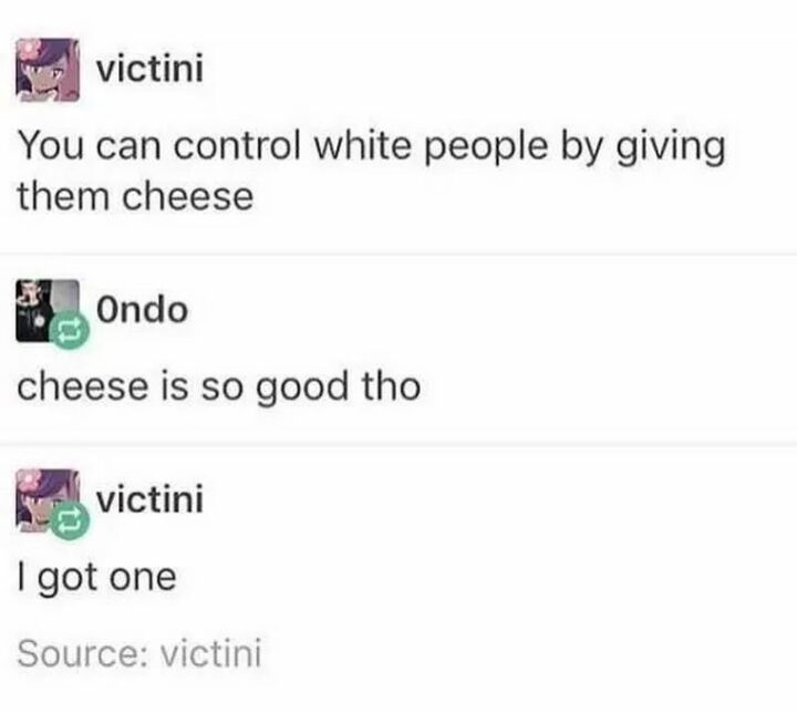 “You can control white people by giving them cheese. Cheese is so good tho. I got one.”