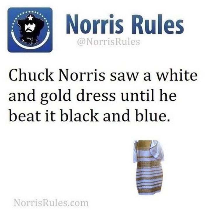 “Chuck Norris saw a white and gold dress until he beat it black and blue.”