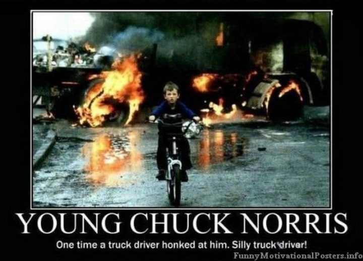 “Young Chuck Norris: One time a truck driver honked at him. Silly truck driver!”