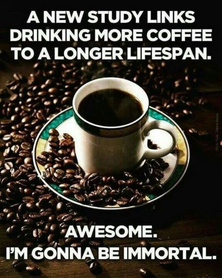 “A new study links drinking more coffee to a longer lifespan. Awesome. I’m gonna be immortal.”