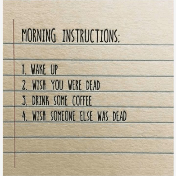 “Morning instructions: 1) Wake up. 2) Wish you were dead. 3) Drink some coffee. 4) Wish someone else was dead.”