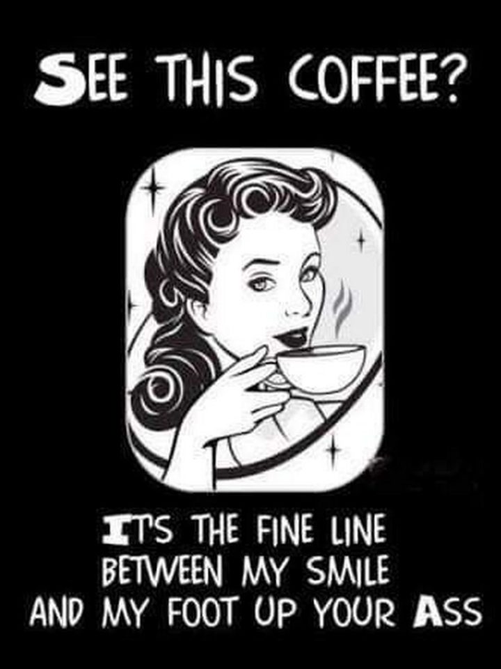 “See this coffee? It’s the fine line between my smile and my foot up your [censored].”