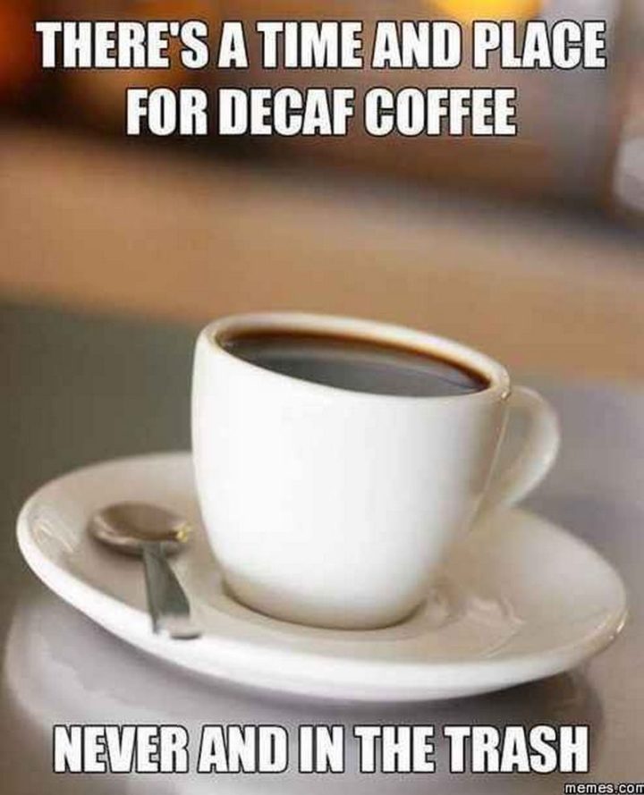 “There’s a time and place for decaf coffee. Never and in the trash.”