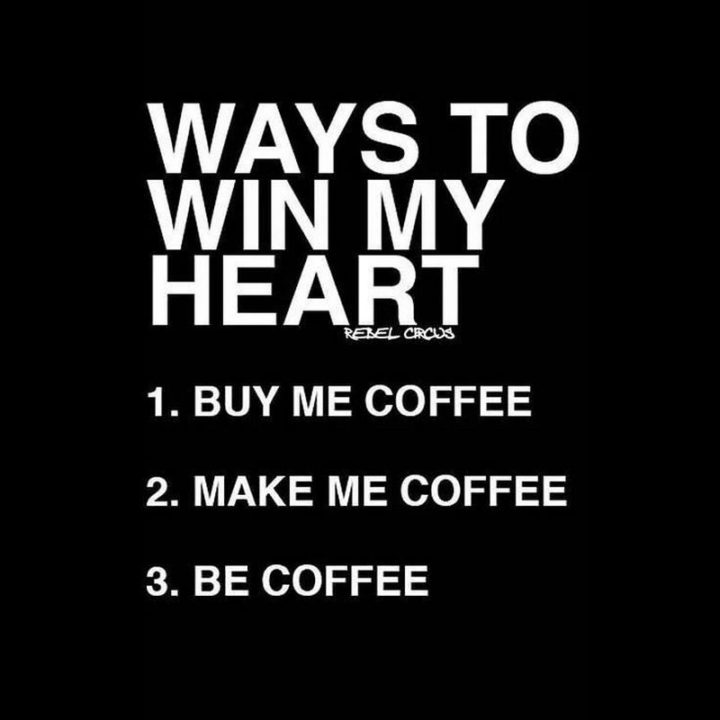 “Ways to win my heart: 1) Buy me coffee. 2) Make me coffee. 3) Be coffee.”