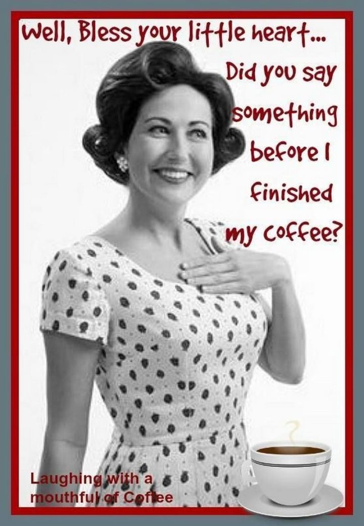 “Well, bless your little heart…Did you say something before I finished my coffee?”