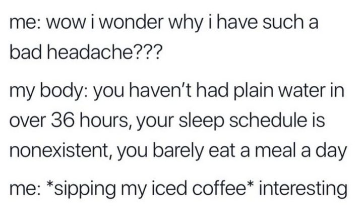 “Me: Wow, I wonder why I have such a bad headache??? My body: You haven’t had plain water in over 36 hours, your sleep schedule is nonexistent, and you barely eat a meal a day. Me: *sipping my iced coffee* Interesting.”