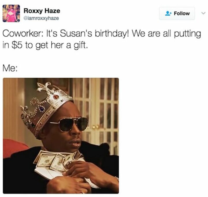 “Coworker: It’s Susan’s birthday! We are all putting in $5 to get her a gift. Me:”