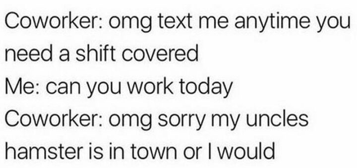 “Coworker: OMG text me anytime you need a shift covered. Me: Can you work today. Coworker: OMG sorry my uncle’s hamster is in town or I would.”