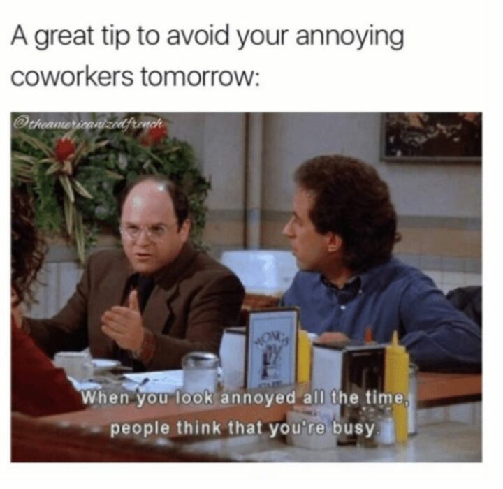 “A great tip to avoid your annoying coworkers tomorrow: When you look annoyed all the time, people think that you’re busy.”