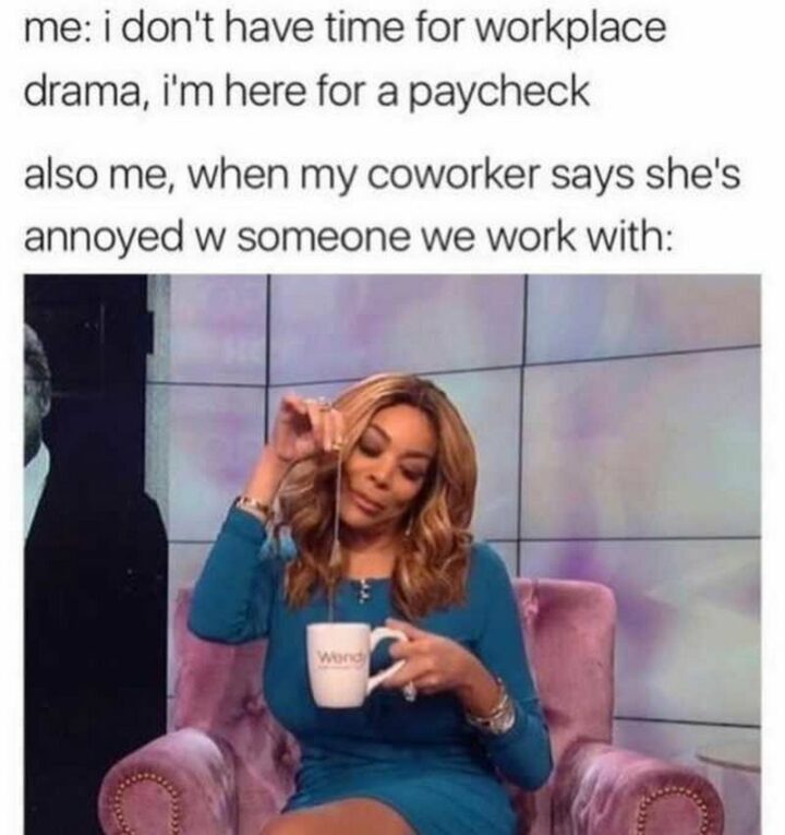 “Me: I don’t have time for workplace drama, I’m here for a paycheck. Also, me, when my coworker says she’s annoyed with someone we work with.”
