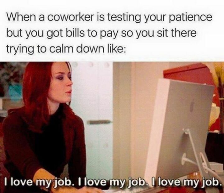 “When a coworker is testing your patience but you got bills to pay so you sit there trying to calm down like: I love my job. I love my job. I love my job.”