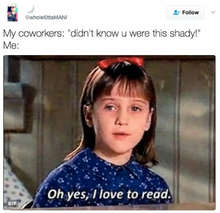 “My coworkers: Didn’t know u were this shady! Me: Oh yes, I love to read.”