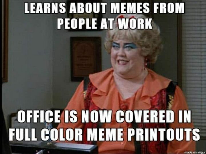 “Learns about memes from people at work. The office is now covered in full-color meme printouts.”