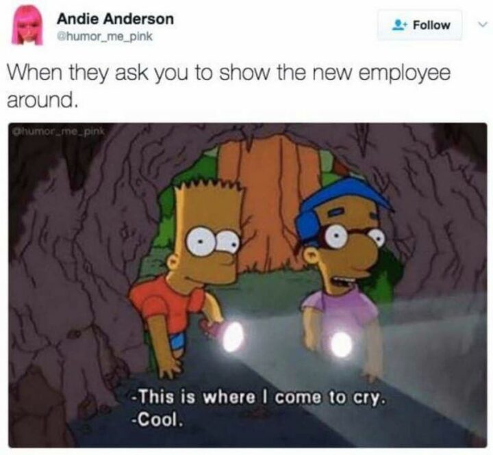 “When they ask you to show the new employee around. This is where I come to cry. Cool.”