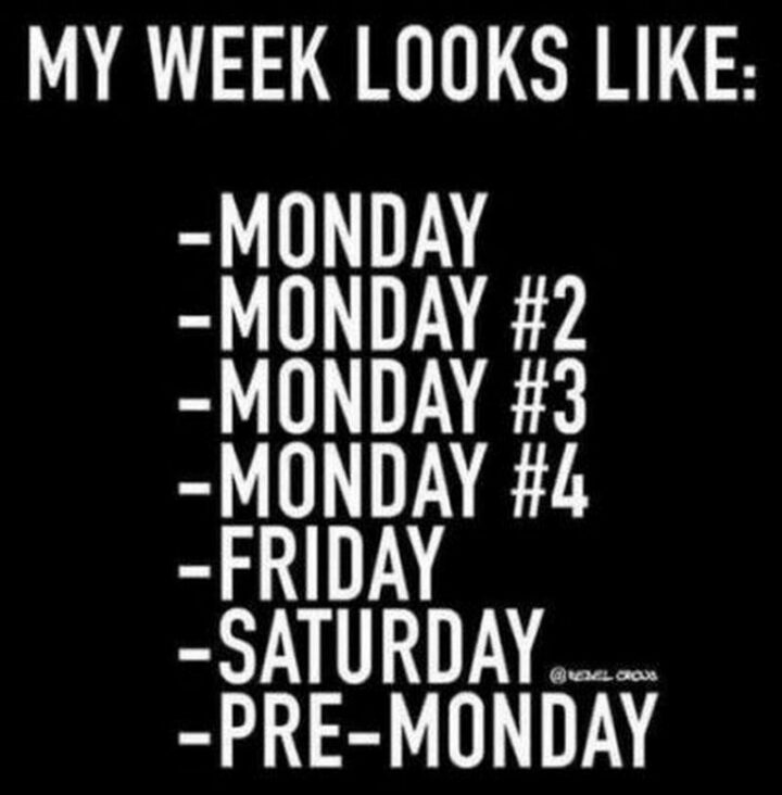 “My week looks like: Monday, Monday #2, Monday #3, Monday #4, Friday, Saturday, pre-Monday.”