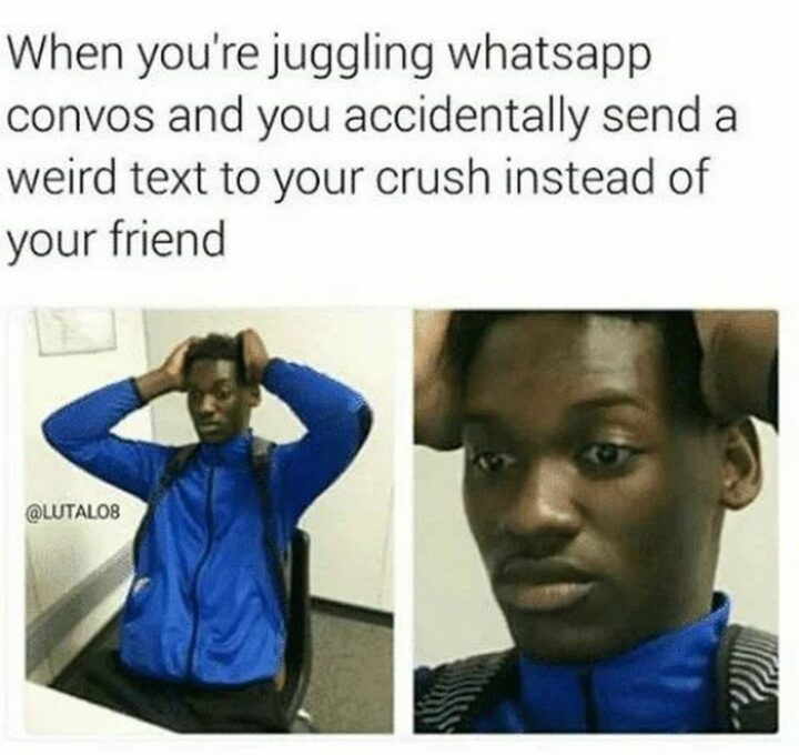 “When you’re juggling WhatsApp convos and you accidentally send a weird text to your crush instead of your friend.”