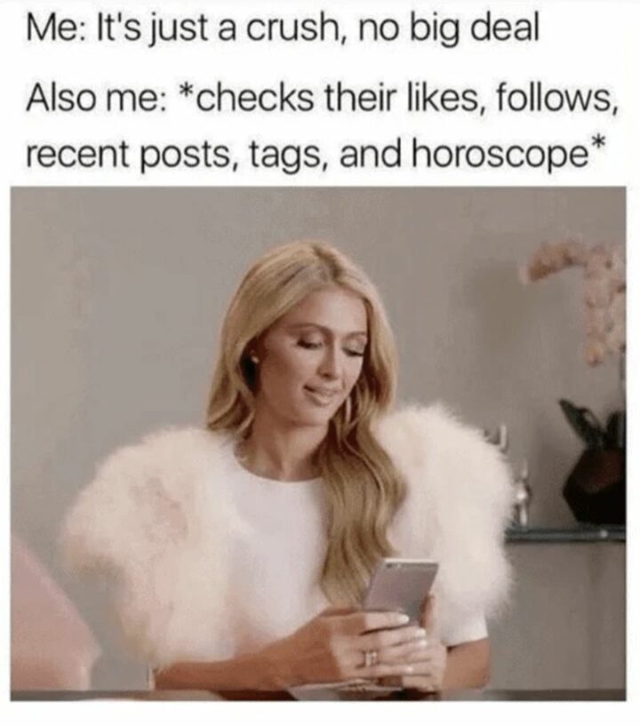 “Me: It’s just a crush, no big deal. Also me: *checks their likes, follows, recent posts, tags, and horoscope*.”