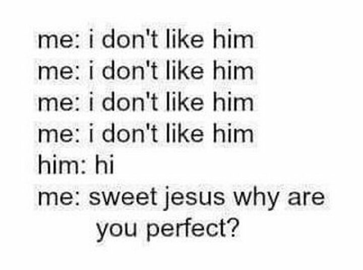 “Me: I don’t like him. Me: I don’t like him. Me: I don’t like him. Me: I don’t like him. Him: Hi. Me: Sweet Jesus why are you perfect?”