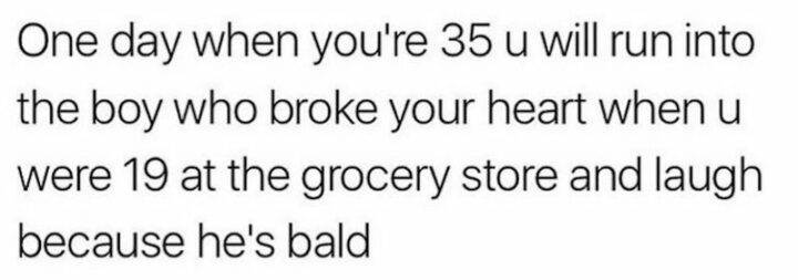 “One day when you’re 35 u will run into the boy who broke your heart when u were 19 at the grocery store and laugh because he’s bald.”