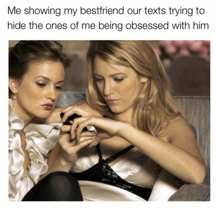 “Me showing my best friend our texts trying to hide the ones of me being obsessed with him.”