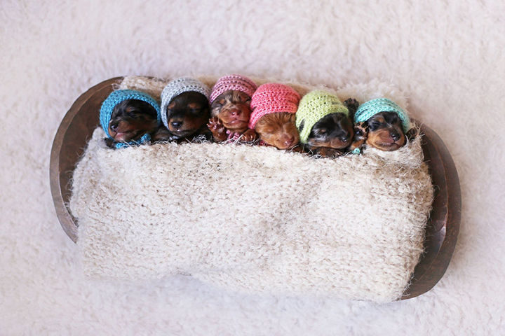 But if you’ve ever seen newborn Dachshunds, you know they take the cuteness factor to a whole new level. One proud Dachshund mom recently posed for a maternity-style photo shoot with her tiny litter of puppies—and the results are nothing short of heart-melting. The newborn pups are all lined up in a row, snoozing peacefully while wearing the most adorable little knitted caps. It’s like a puppy version of a baby photo shoot, and it’s honestly too much cuteness to handle.