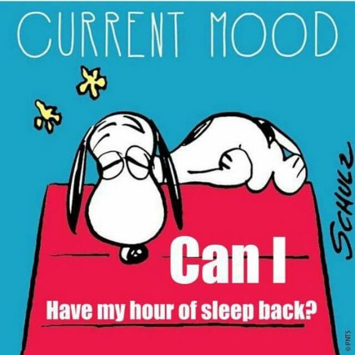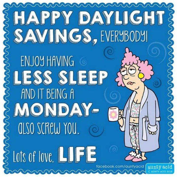“Happy daylight savings, everybody! Enjoy having less sleep and it being a Monday – Also screw you. Lots of love, life.”