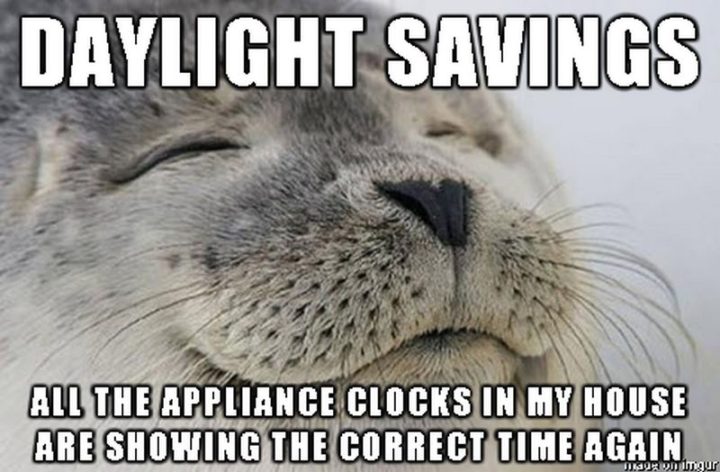 “Daylight savings. All the appliance clocks in my house are showing the correct time again.”