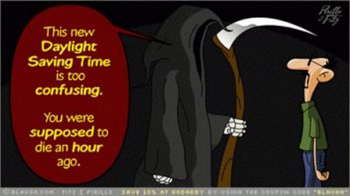 “This new daylight savings time is too confusing. You were supposed to die an hour ago.”