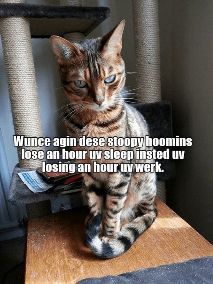 “Wunce agin dese stoopy hoomins lose an hour uv sleep insted uv losing an hour uv werk.”