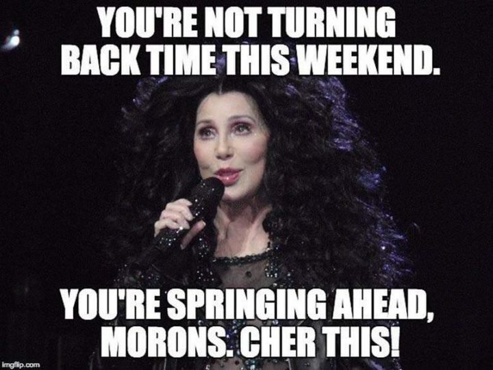 “You’re not turning back time this weekend. You’re springing ahead, morons, Cher this!”