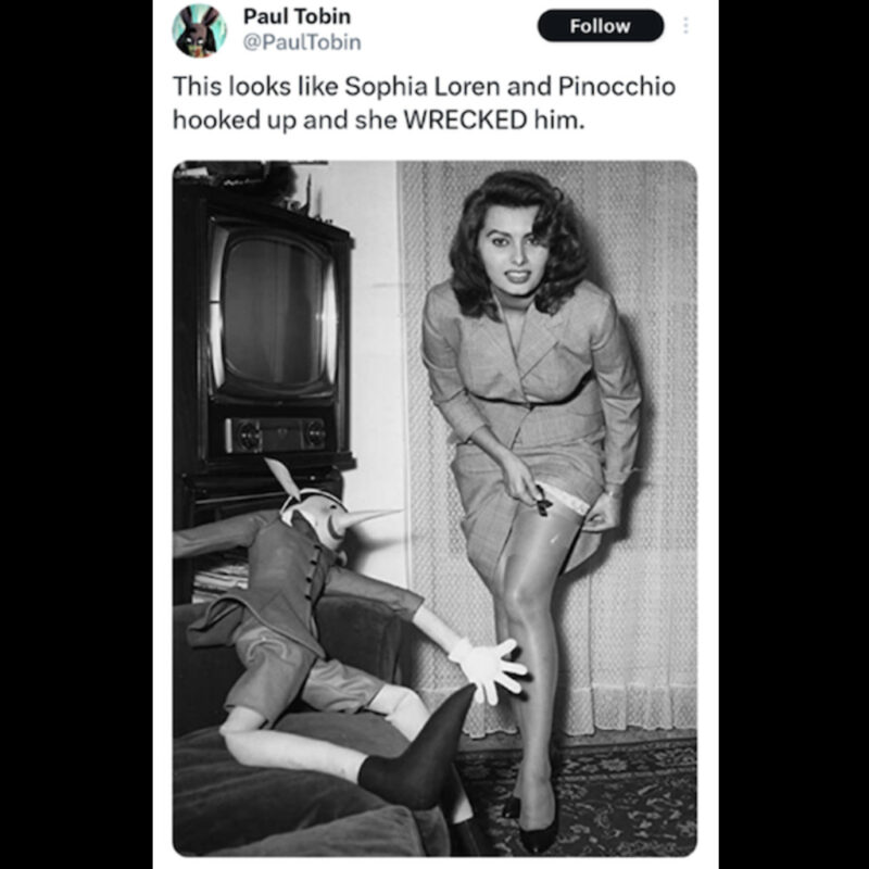 “This looks like Sophia Loren and Pinocchio hooked up and she wrecked him.”