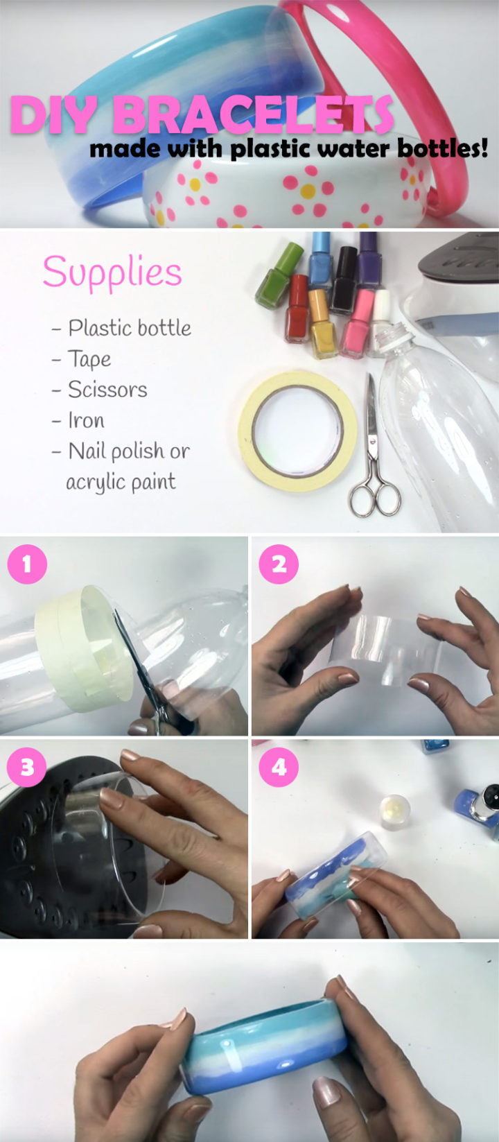 It sounds crazy but Innova Crafts has created an awesome video tutorial for creating DIY bracelets by upcycling plastic water bottles and they look beautiful! First, she cuts a piece from a plastic water bottle and puts it next to a clothes iron which makes it curl up and create a lovely bracelet that can be decorated using nail polish or acrylic paint.