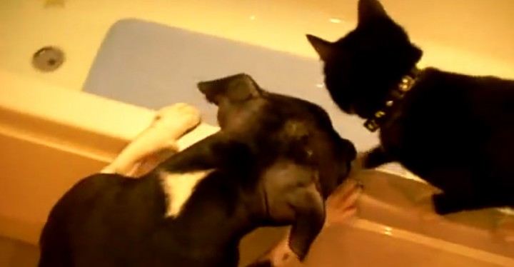 Watch the hilarious moment when a dog pushes a cat into the tub…