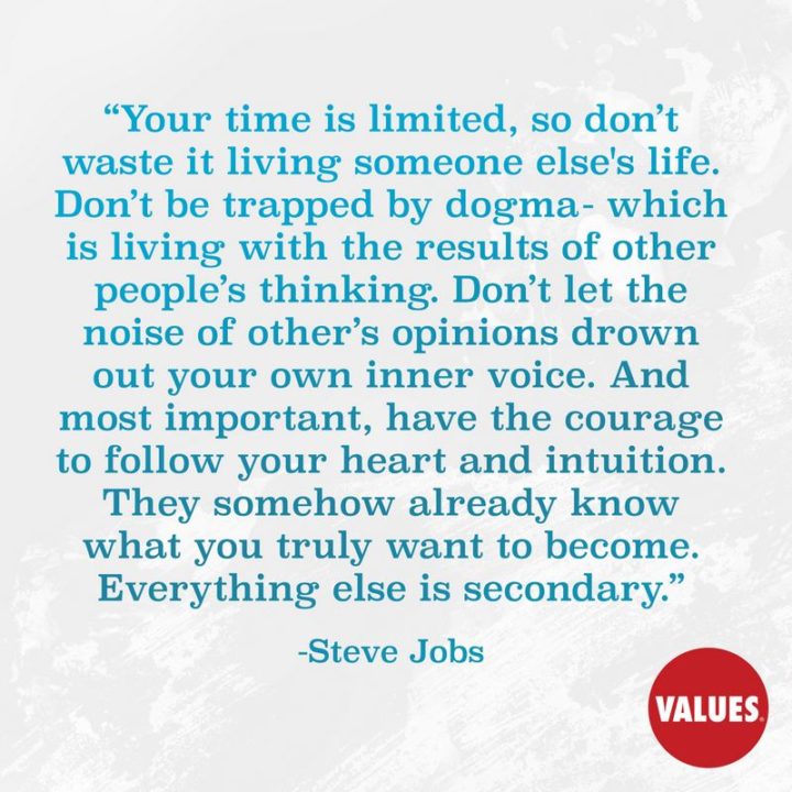 “Your time is limited, so don’t waste it living someone else’s life. Don’t be trapped by dogma – which is living with the results of other people’s thinking. Don’t let the noise of other’s opinions drown out your own inner voice. And most important, have the courage to follow your heart and intuition. They somehow already know what you truly want to become. Everything else is secondary.” – Steve Jobs