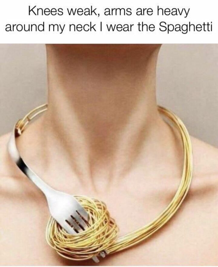 16) “Knees weak, arms are heavy, around my neck I wear the spaghetti.”