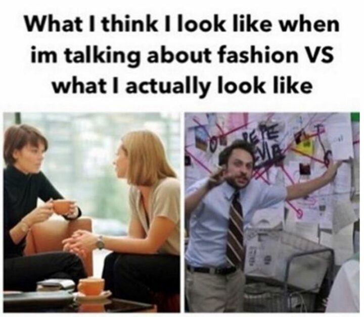 31) “What I think I look like when I’m talking about fashion VS what I actually look like.”