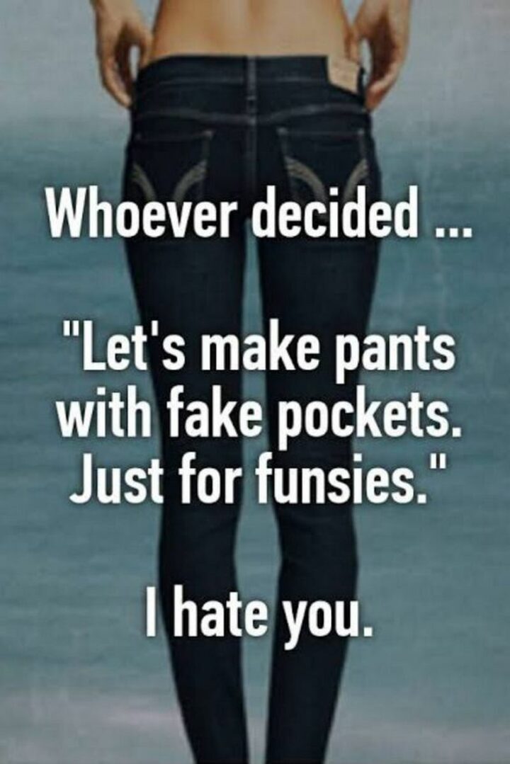 38) “Whoever decided…’Let’s make pants with fake pockets. Just for funsies.’ I hate you.”