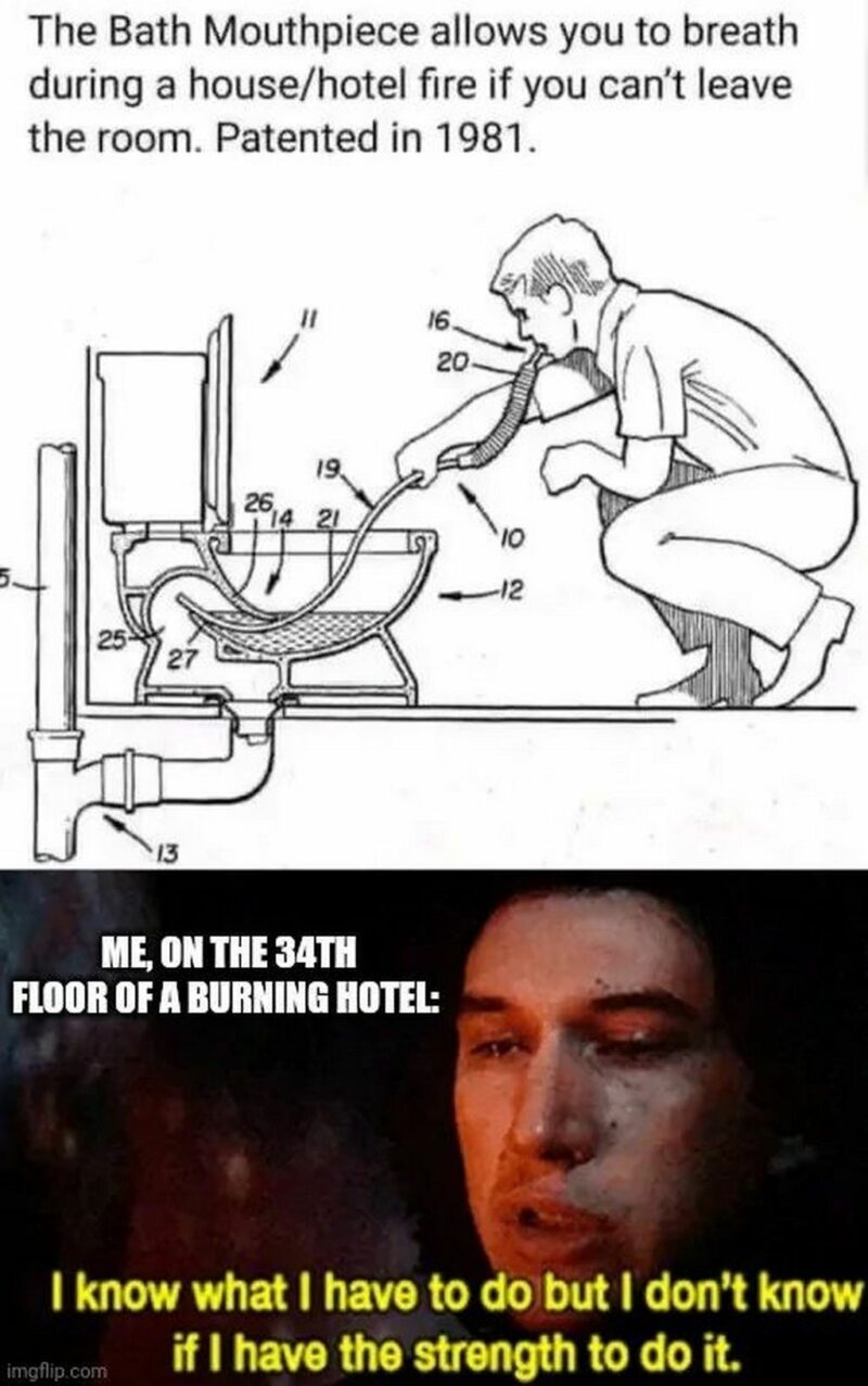“The bath mouthpiece allows you to breathe during a house/hotel fire if you can’t leave the room. Patented in 1981. Me on the 34th floor of a burning hotel: I know what I have to do but I don’t know if I have the strength to do it.”