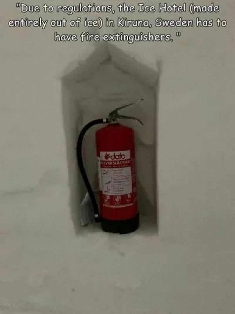 “Due to regulations, the Ice Hotel (made entirely out of ice) in Kiruna, Sweden has to have fire extinguishers.”