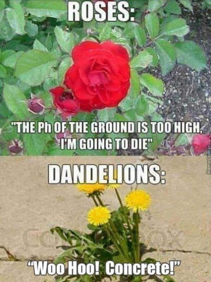 “Roses: The pH of the ground is too high. I’m going to die. Dandelions: Woo Hoo! Concrete!”
