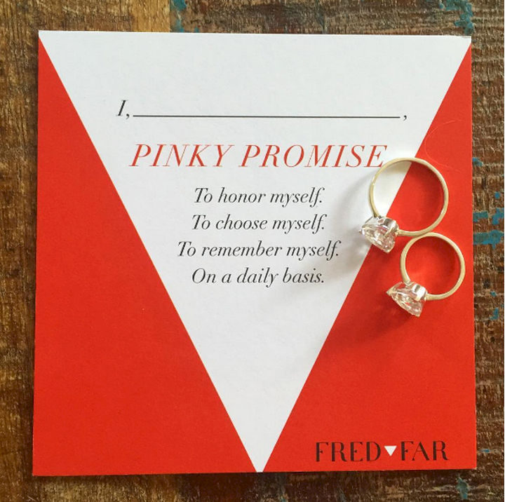 Each self-love pinky ring comes with a pledge card from Fred and Far where you commit yourself to honor, choose, and remember the person you are on a daily basis.