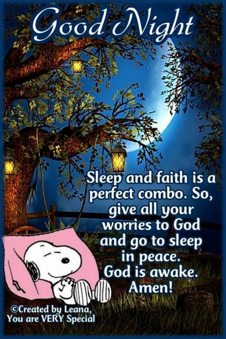 16) “Good night. Sleep and faith are a perfect combo. So, give all your worries to God and go to sleep in peace. God is awake. Amen! Created by Leana, you are very special.” – Snoopy