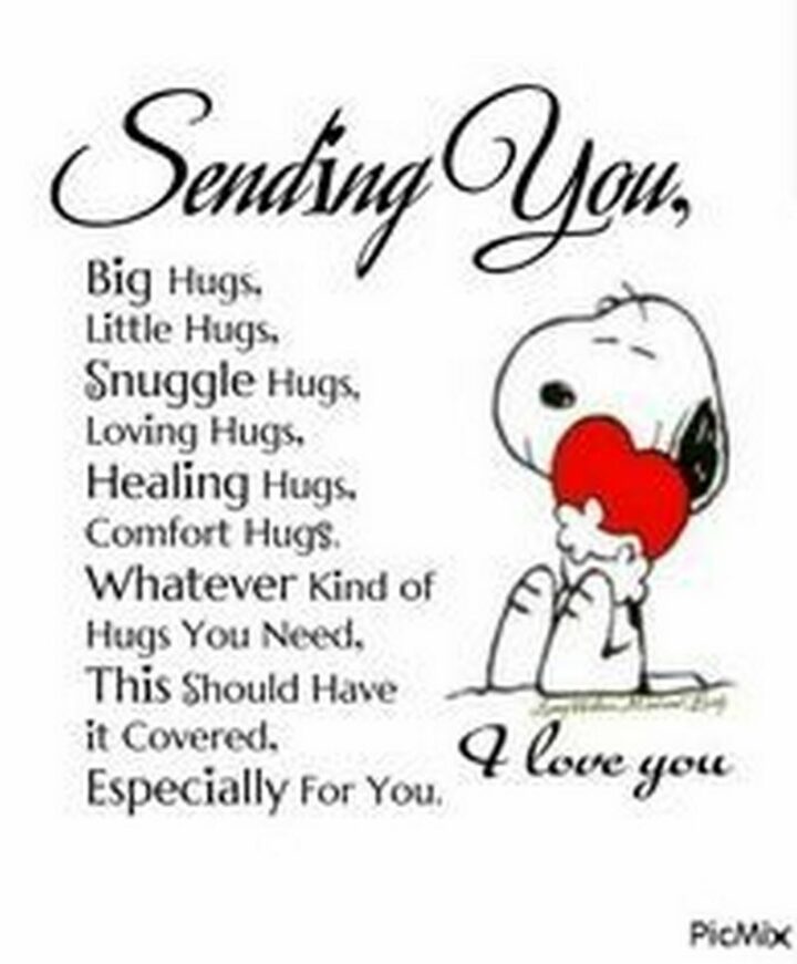 20) “Sending you, big hugs, little hugs, snuggle hugs, loving hugs, comfort hugs. Whatever kind of hug you need, this should have it covered, especially for you. I love you.” – Snoopy