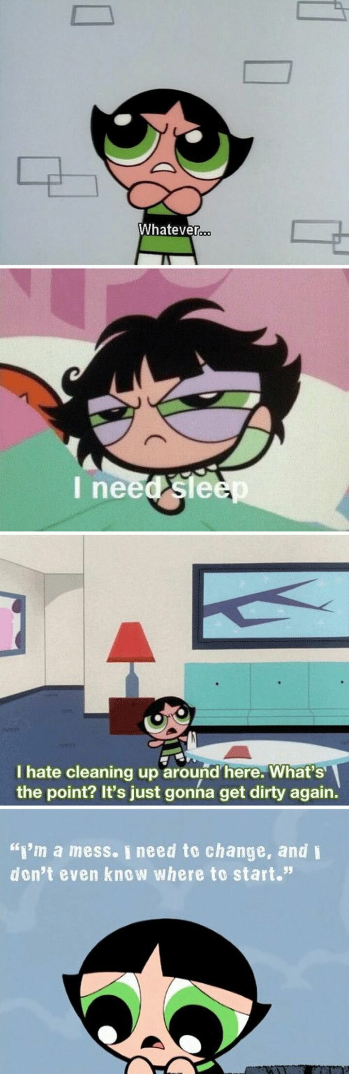 29) “Whatever. I need sleep. I hate cleaning up around here. What’s the point? It’s just gonna get dirty again. I’m a mess. I need to change, and I don’t even know where to start.” – Buttercup, The Powerpuff Girls