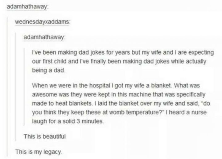 “I’ve been making dad jokes for years but my wife and I are expecting our first child and I’ve finally been making dad jokes while actually being a dad. When we were in the hospital I got my wife a blanket. What was awesome was they were kept in this machine that was specifically made to heat blankets. I laid the blanket over my wife and said, ‘do you think they keep these at womb temperature?’ I heard a nurse laugh for a solid 3 minutes.”