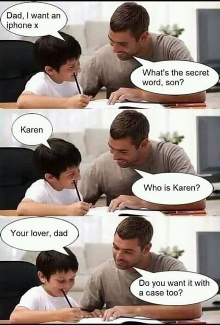 “Dad, I want an iPhone X. What’s the secret word, son? Karen. Who is Karen? Your lover, dad. Do you want it with a case too?”