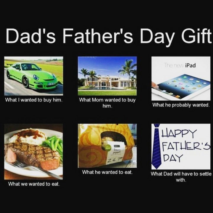 “Dad’s Father’s Day Gift: What I wanted to buy him. What mom wanted to buy him. What he probably wanted. What we wanted to eat. What he wanted to eat. What dad will have to settle with.”