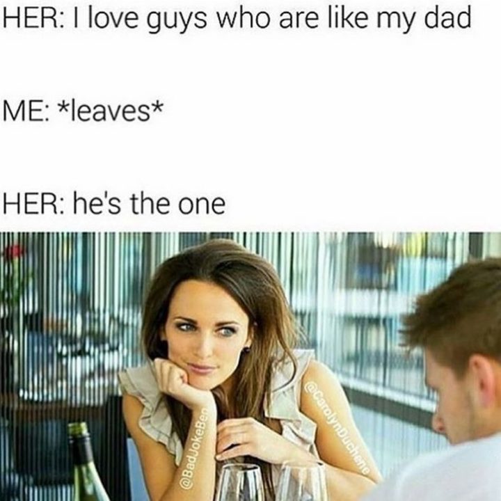 “HER: I love guys who are like my dad. ME: *leaves*. HER: He’s the one.”
