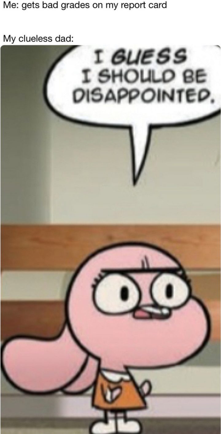 “Me: Gets bad grades on my report card. My clueless dad: I guess I should be disappointed.”